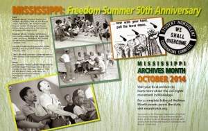 Each October the nation celebrates our country’s rich historical collections. The Mississippi Historical Records Advisory Board (MHRAB) and the Society of Mississippi Archivists (SMA) are co-sponsoring a poster entitled Mississippi: Freedom Summer 50th Anniversary to promote Mississippi Archives Month 2014. The poster features archival items related to the events of 1964 and encourages all Mississippians to learn more about the civil rights movement in Mississippi by visiting local archives, libraries, museums, and historical societies. Several Mississippi institutions will present events commemorating Archives Month. For information about events during Archives Month throughout Mississippi, please visit www.msarchivists.org. For information about celebrations nationwide, visit www.statearchivists.org.
